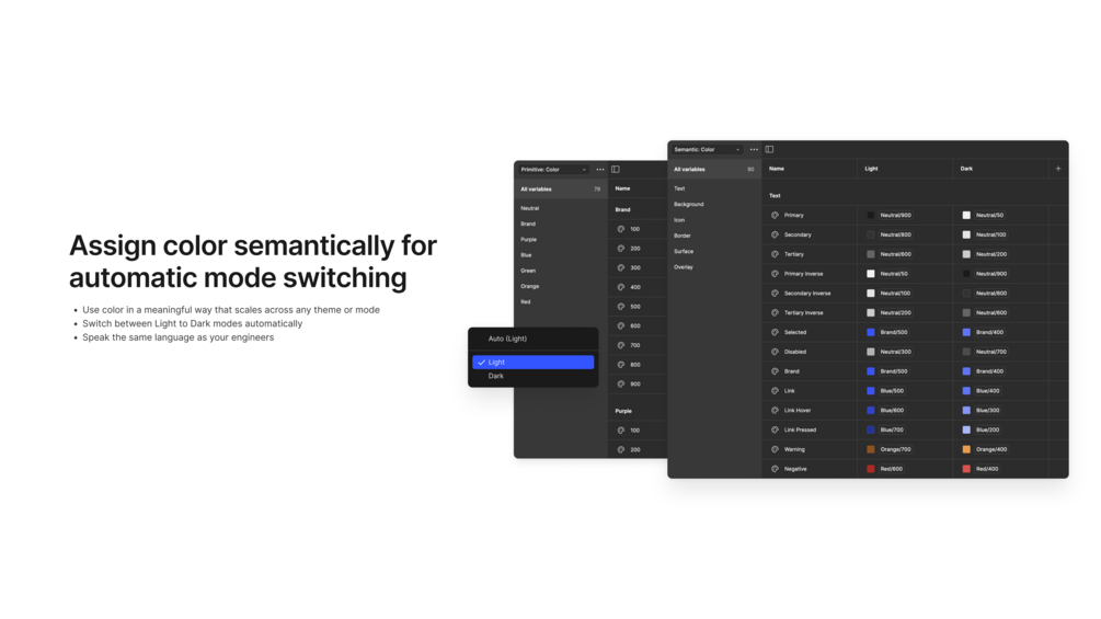 Semantic Color, Responsive Typography, Spacing, Border, Elevation and more.